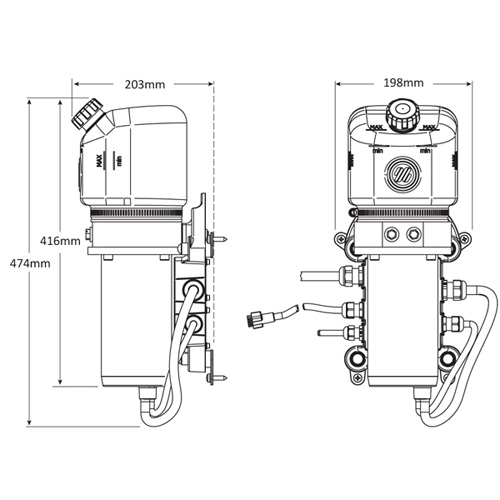 * 12VDC Motor.\n* 45 degree swiveling fittings for easy installation.\n* Semitransparent 0,5 litre (0.11gal) tank gives immediate level vision.\n* Vented filler plug.\n* Wall or floor mount.\n* Black galvanized motor case, salt water resistant.\n* 4.5 m (15') Wiring Harness included.\n* IP67 waterproof.\n* Ignition protected (SAE J-1171 and UNI EN 28846).