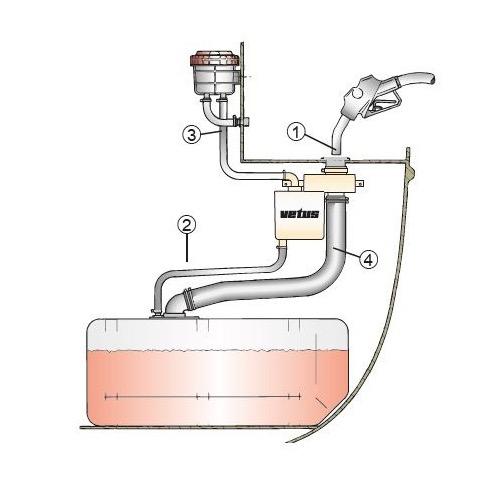 A VETUS diesel smell filter may be installed into this breather line as well. If the diesel smell filter is positioned well above the deck, the breather line may exit below the deck level, if so required. FS is supplied with connections for Ø38 mm or for Ø51 mm fuel filling hose (4).
