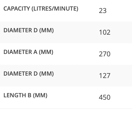 SpecificationsExcellent sound reductionMinimal back pressure Drain valve for winter storageSuitable for Ø 90, 102, 127, 152, 209 or 250 mm internal hose diametersCapacities of 23, 75 or 130 litres