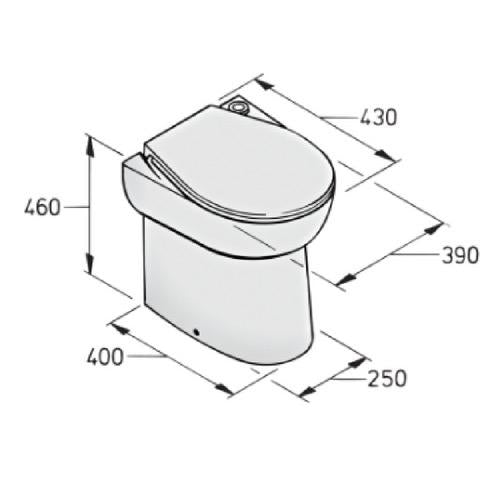 Comfortable floor standing toilet with porcelain bowl and a normal sized seat and lid.