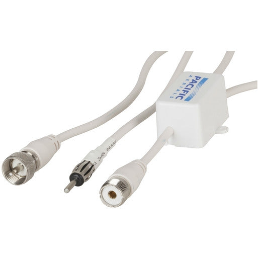 This device allows you to your AM/FM Radio to the VHF marine antenna. It will prevent the high-power VHF signal going into the front end of your radio so you get the benefit of a nice and high antenna for your broadcast signal when you are not using the VHF marine rig. There is virtually no loss of the VHF power.