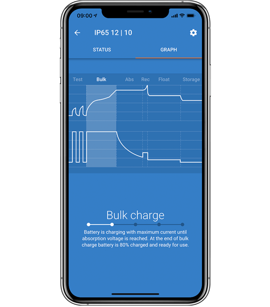 The Blue Smart IP65 is equipped with built-in Bluetooth, so the status of the charger and the battery can be checked on a smartphone, tablet or laptop. All settings of the charger can be configured with the VictronConnect app. The VictronConnect app allows you to Setup, readout and configure your Blue Smart IP65 Charger via your smartphone (Apple and Android). You can display the status of your charger and battery and even control the functions of your charger using the VictronConnect app. On your screen the readout of voltage and current is default available.