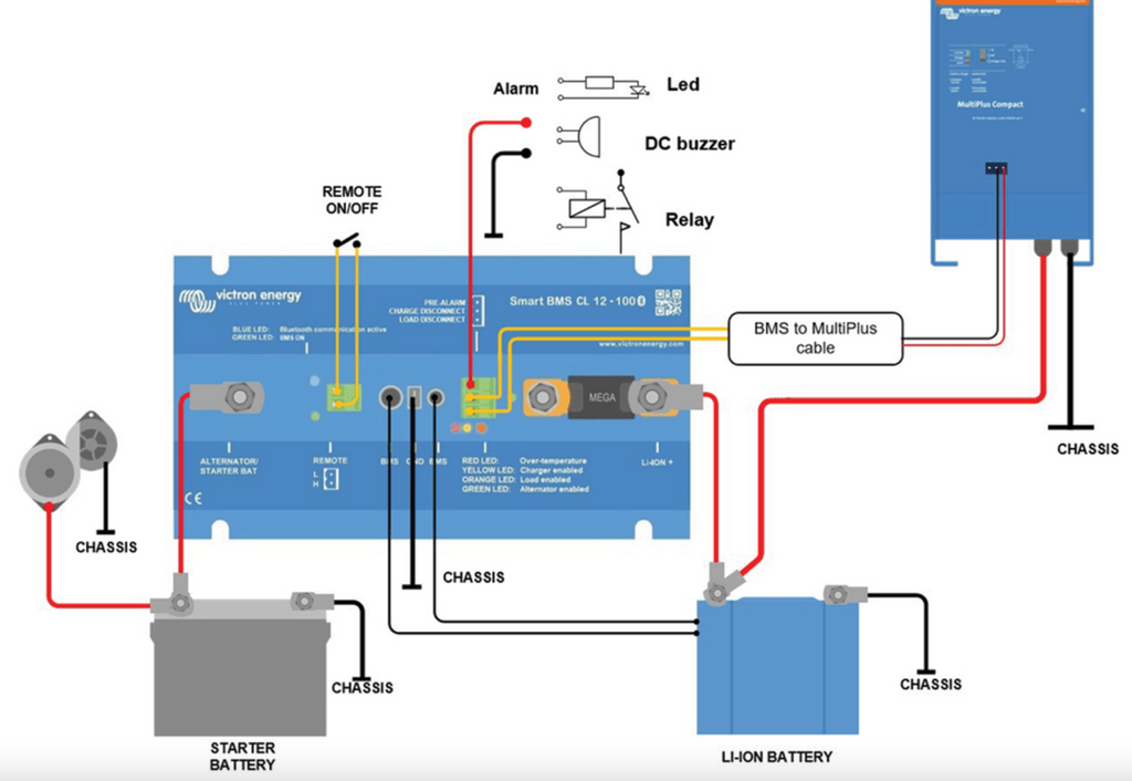 Both the Load/Charge Disconnect outputs of Smart BMS CL 12-100 and Load/Charger outputs of the smallBMS must be in ‘High’ state in order for the MultiPlus to operate. After shutdown due to low battery voltage, run the alternator or use a battery charger on the primary side of the BMS to reset the system. The MultiPlus will then switch on and start charging (if connected to an AC power source).