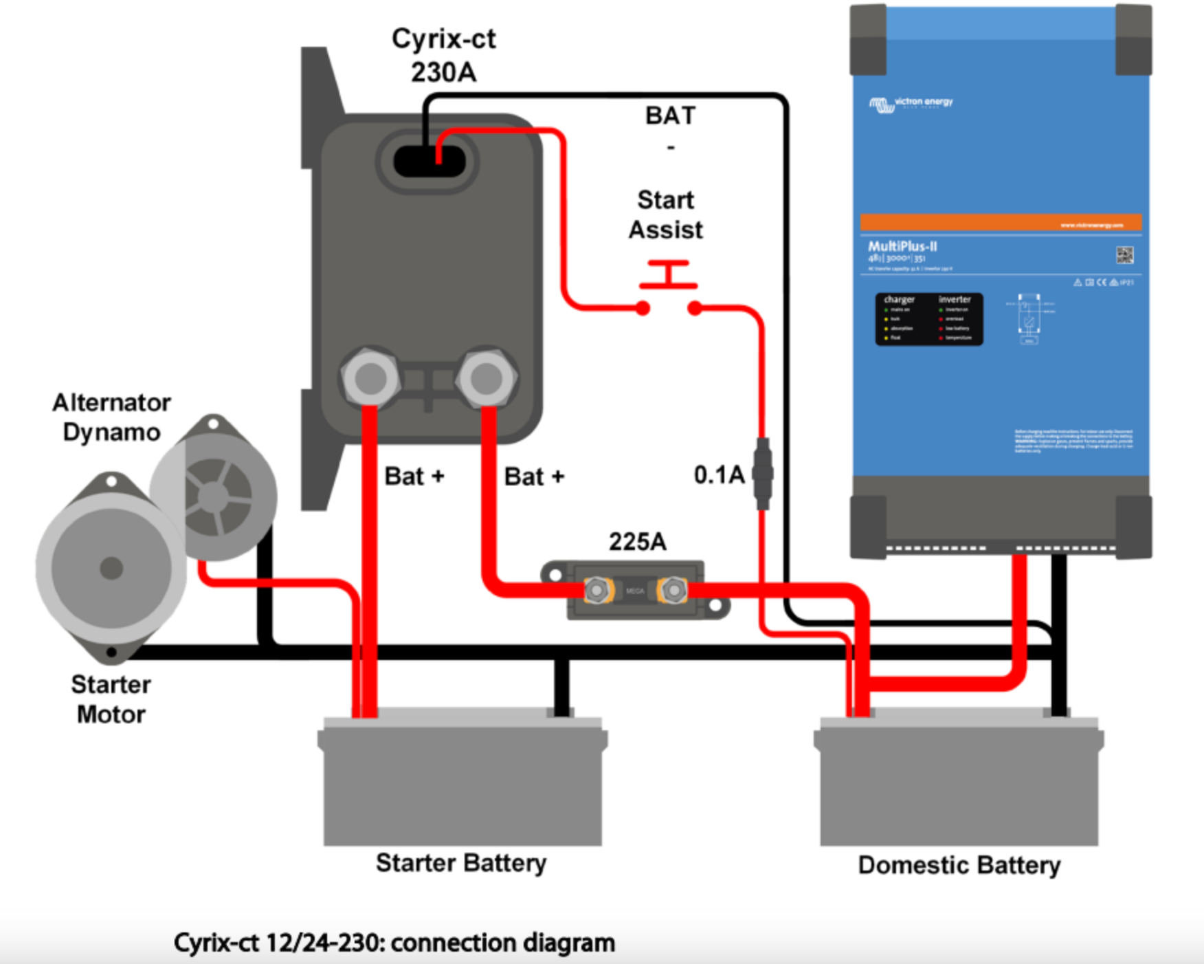 The Cyrix can also be engaged with a push button (Cyrix remains engaged for 30 seconds) or a switch to connect batteries in parallel manually. This is especially useful in case of emergency when the starter battery is discharged or damaged