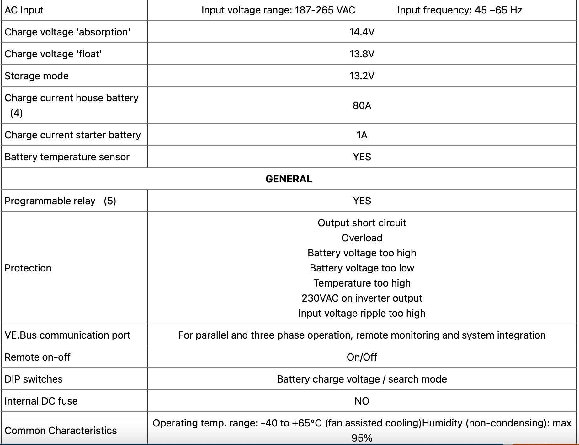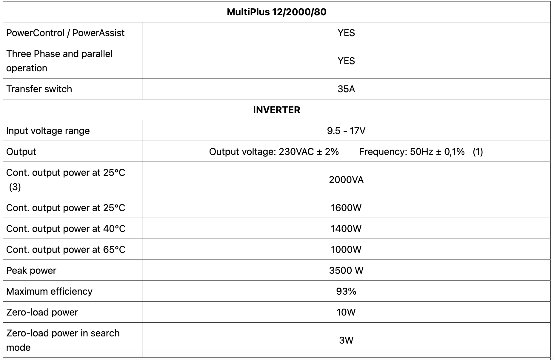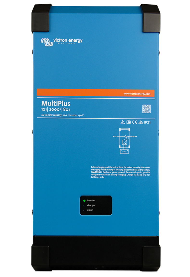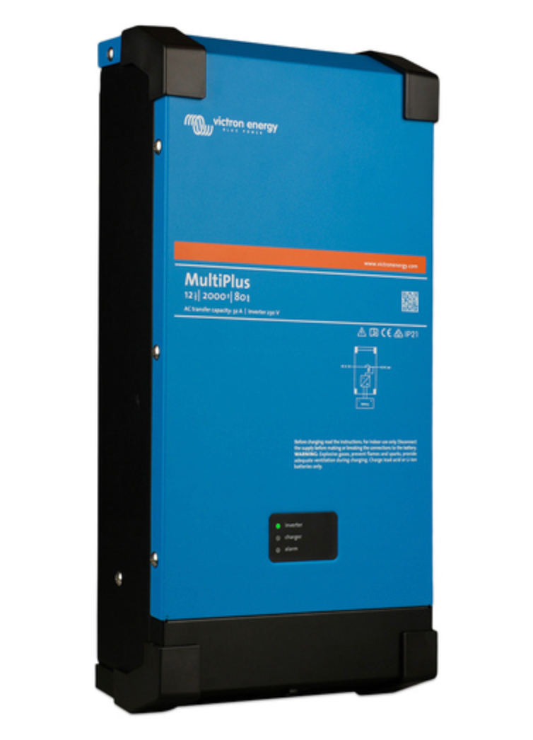 Victron MultiPlus 230 Volt AC, 12 Volt 2000VA (1600W at 0.8PF) Inverter Charger with 80 Amp battery charging and 32 Amp AC transfer capability. Compatible with all batteries including Lithium.