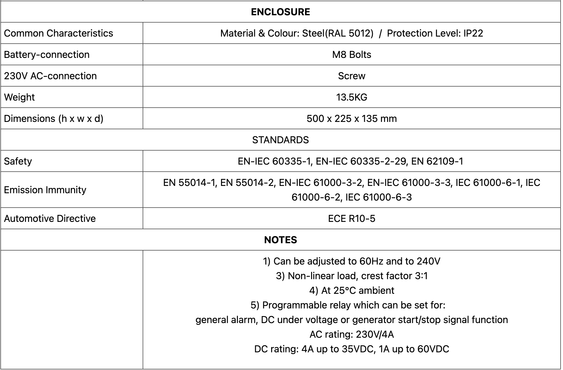 By default, the programmable relay is set as an alarm relay, i.e. the relay will de-energise in the event of an alarm or a pre-alarm (inverter almost too hot, ripple on the input almost too high, battery voltage almost too low).