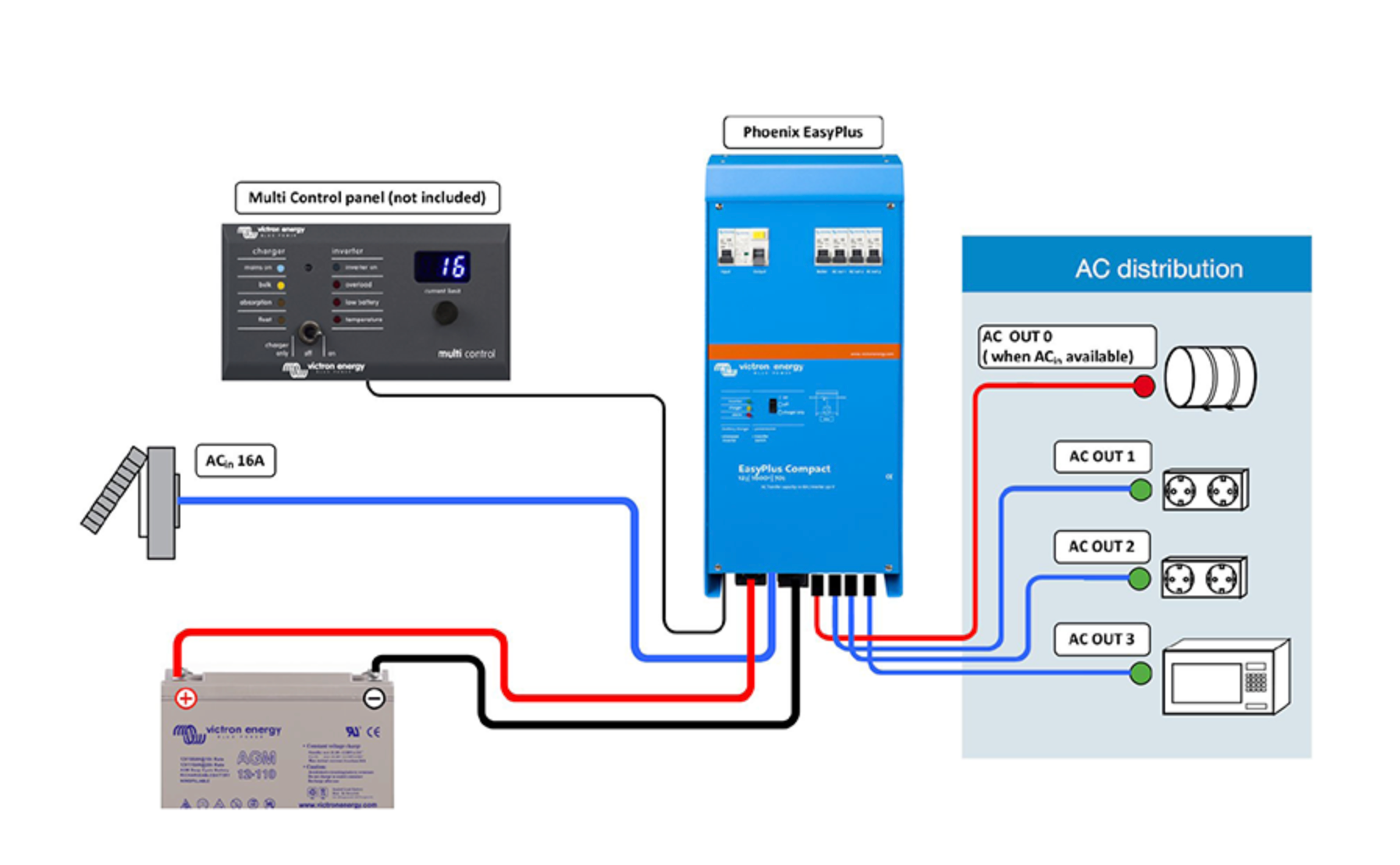 With the Multi Control Panel a maximum generator or shore current can be set. The MultiPlus will then take account of other AC loads and use whatever is extra for charging, thus preventing the generator or shore supply from being overloaded.