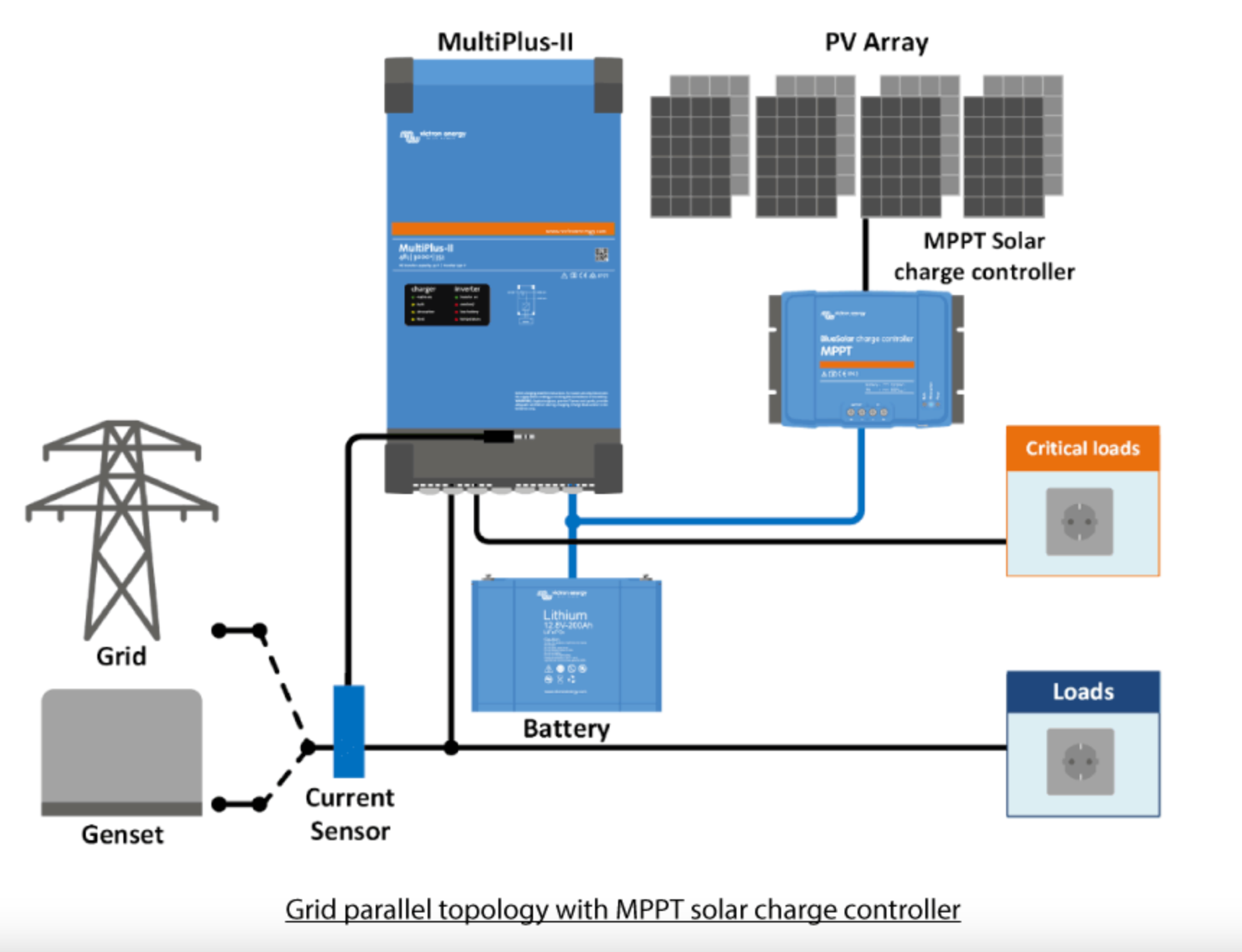 Incorporating all the features of the MultiPlus inverter and charger combinations, the Multiplus II adds an external current sensor option to enable the PowerControl and PowerAssist functions to extend to 50A and 100A respectively. It can be used in off-grid as well as grid-connected PV and other alternative energy systems and is compatible with both solar charger controllers and grid-tie inverters. Added to this, with many countries approving the unit for ESS application this unit is able to feed back into the grid, any power excess to requirements.;
