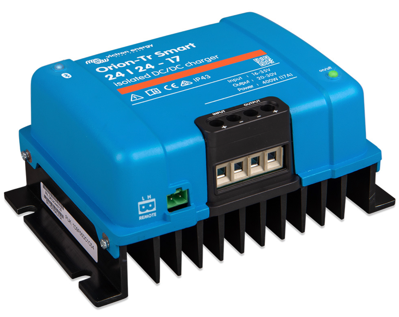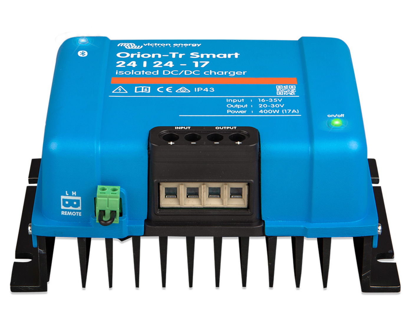Victron Orion-Tr Smart 24V to 24V 17Amp (400W) DC to DC Battery charger with galvanic isolation. 3-stage battery charge algorithm for Lead-acid, AGM & Lithium. Bluetooth Smart built-in.