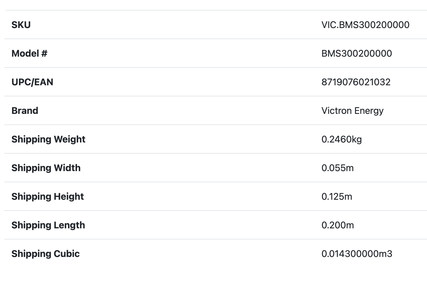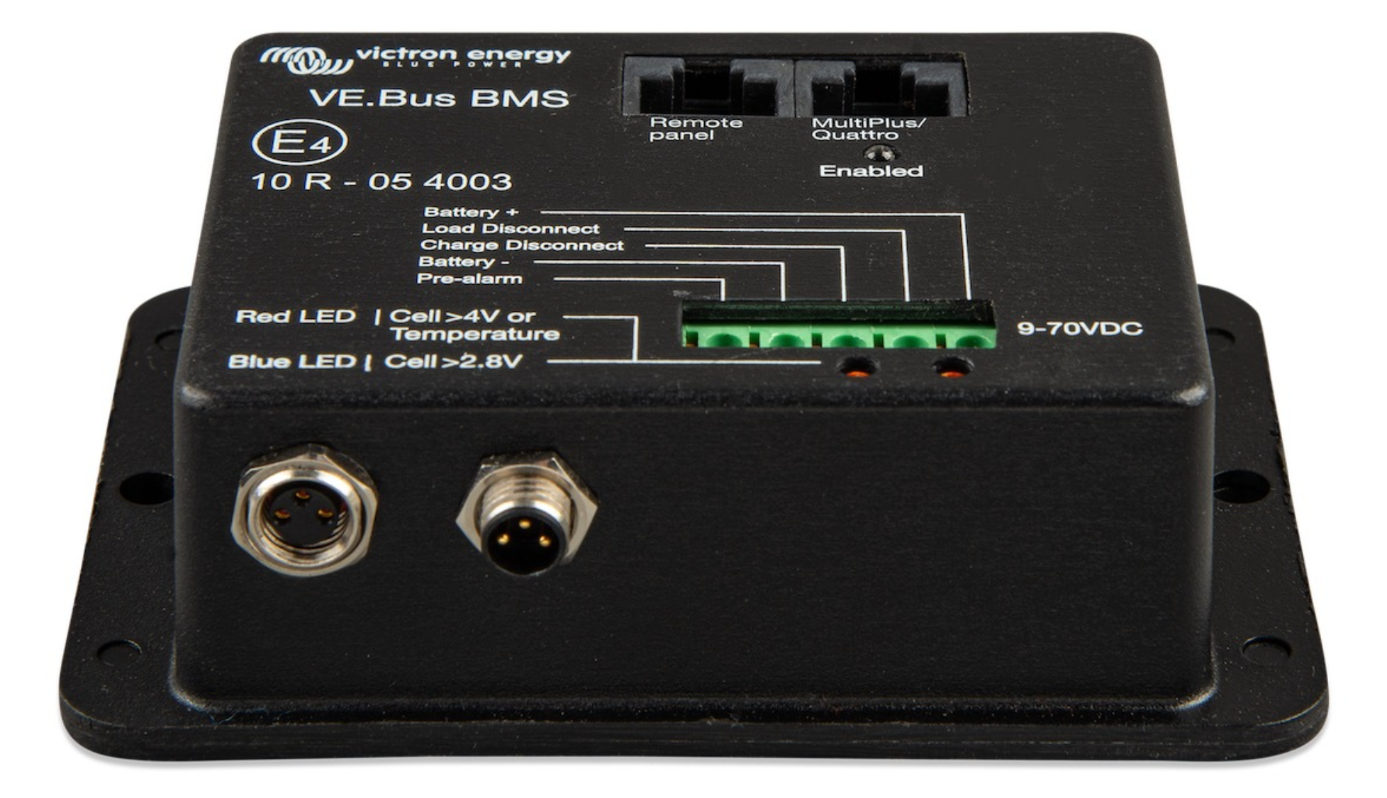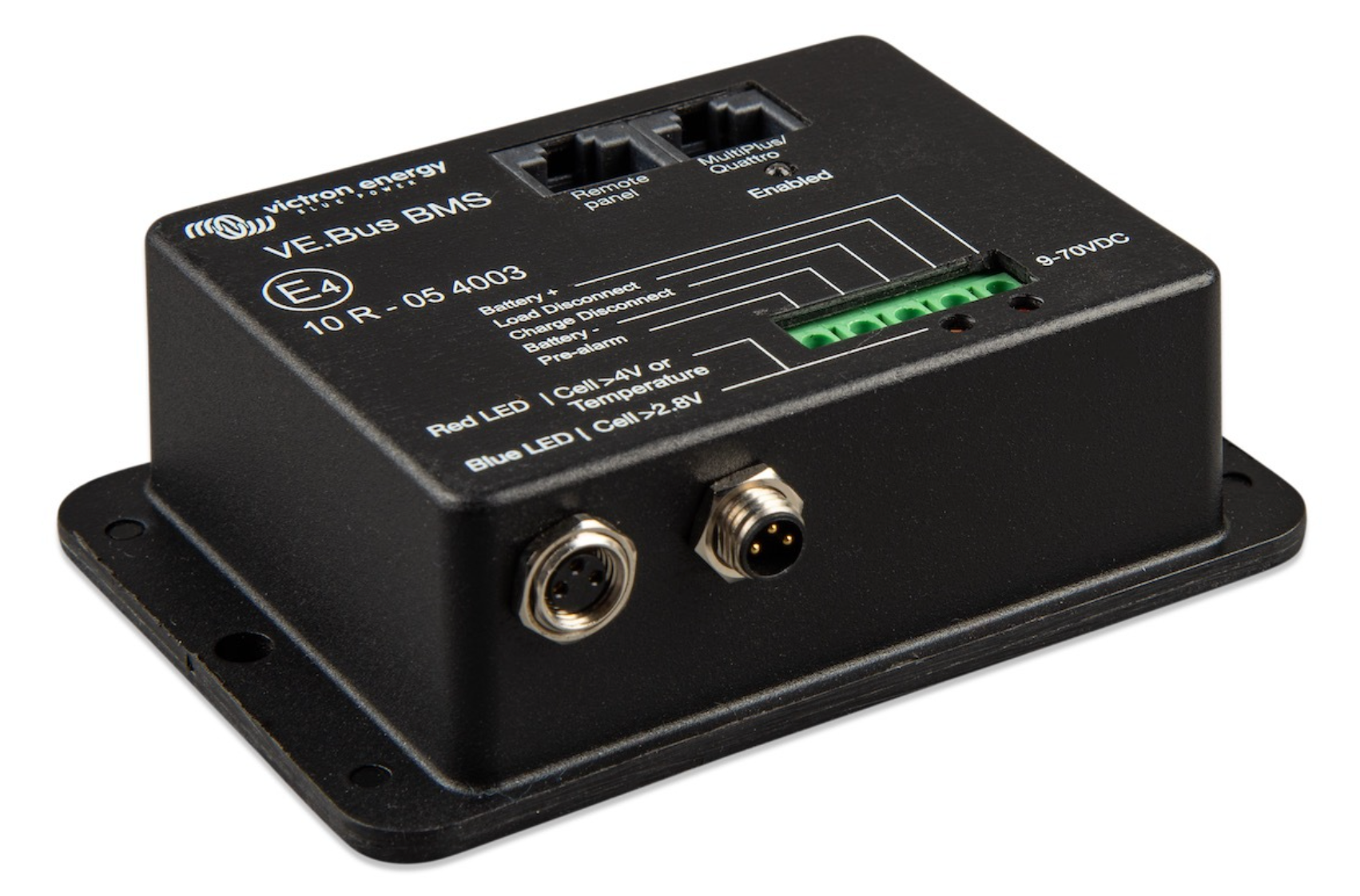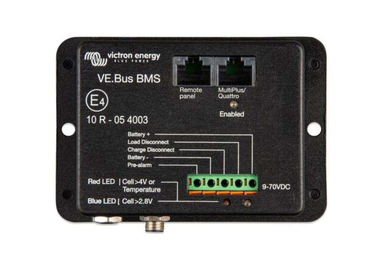 The VE.Bus BMS is a Battery Management Systems (BMS) designed to interface with and protect a single, or multiple Victron Lithium Battery 12,8V & 25,6V Smart (LiFePO4 or LFP) in systems that have Victron inverters or inverter/chargers with VE.Bus communication. It monitors and protects the batteries against over voltage and under voltage of any individual cell, and also over temperature or under temperature conditions.