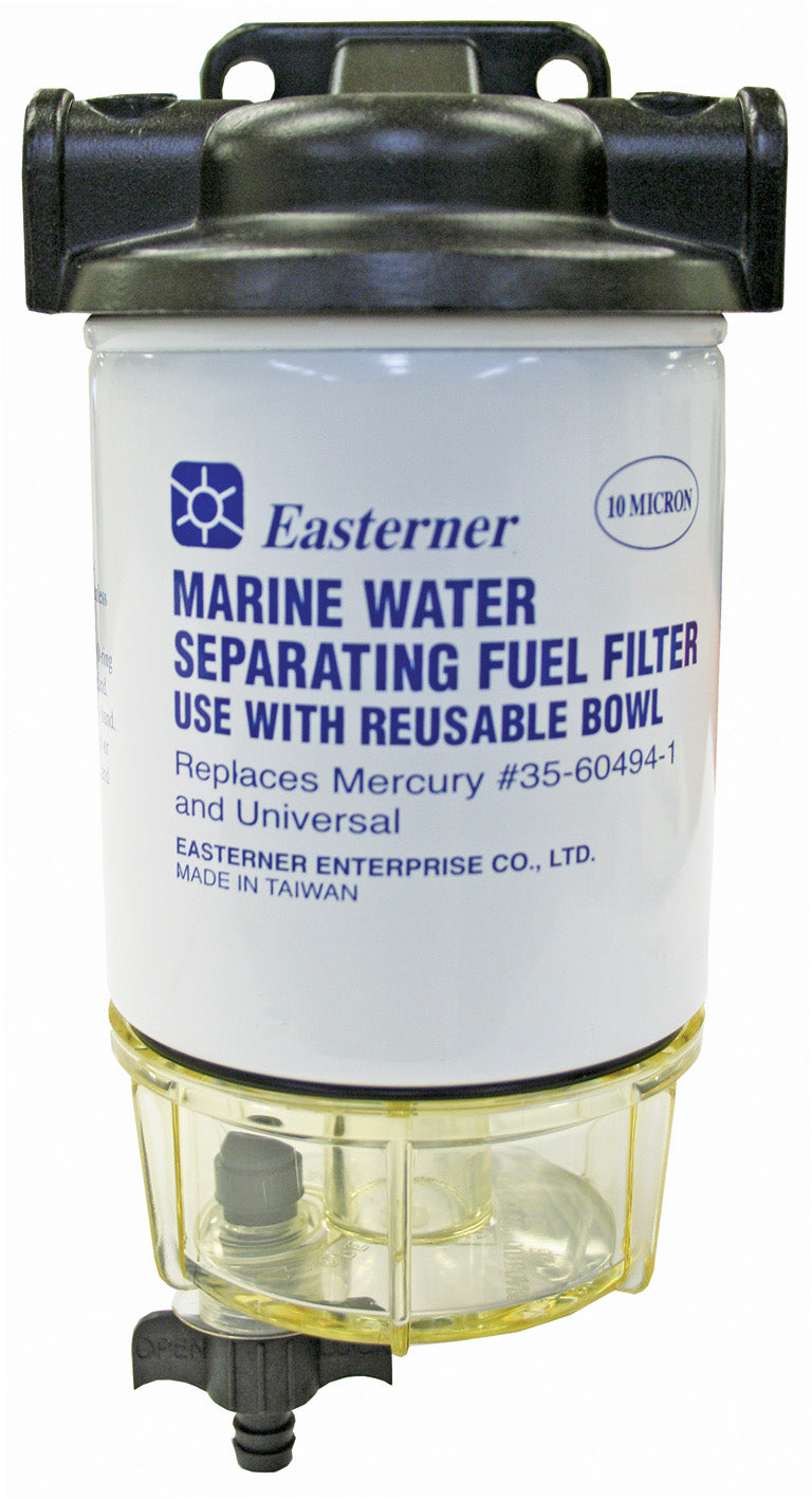 Complete water separating fuel filters with clear easy-viewing bowl with screw plug drain and 10 micron spin-on filter element.